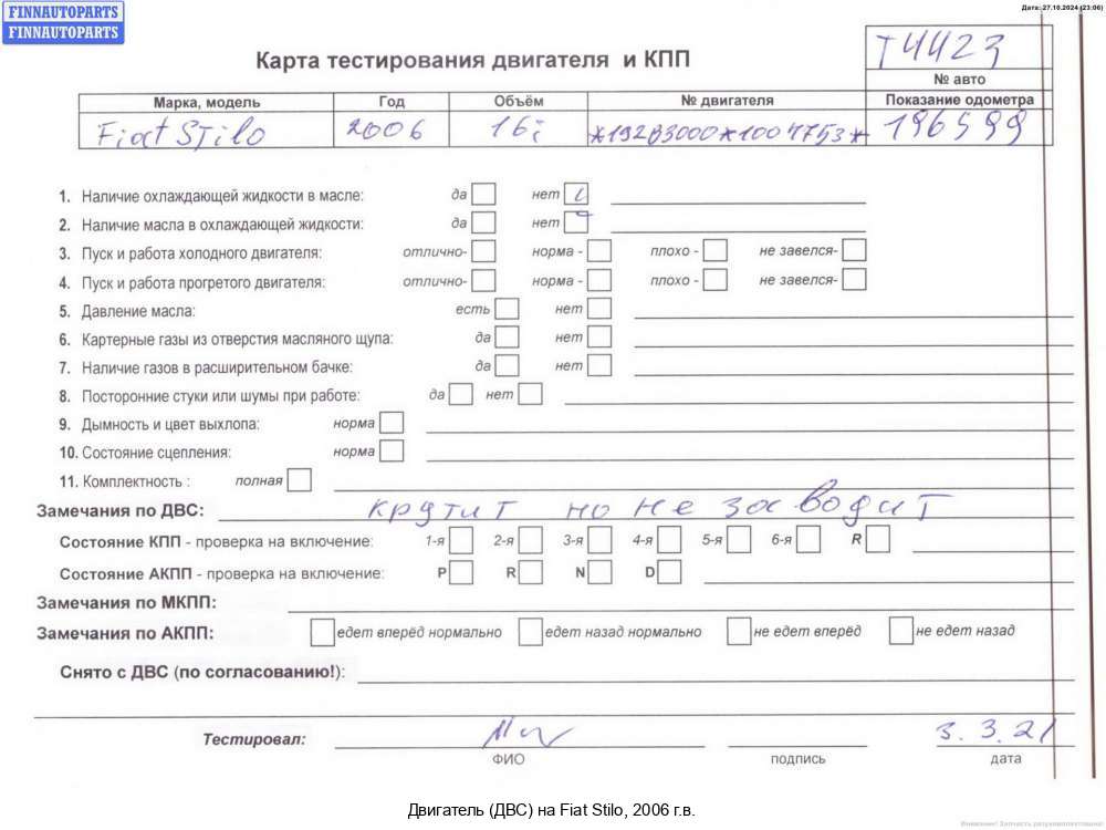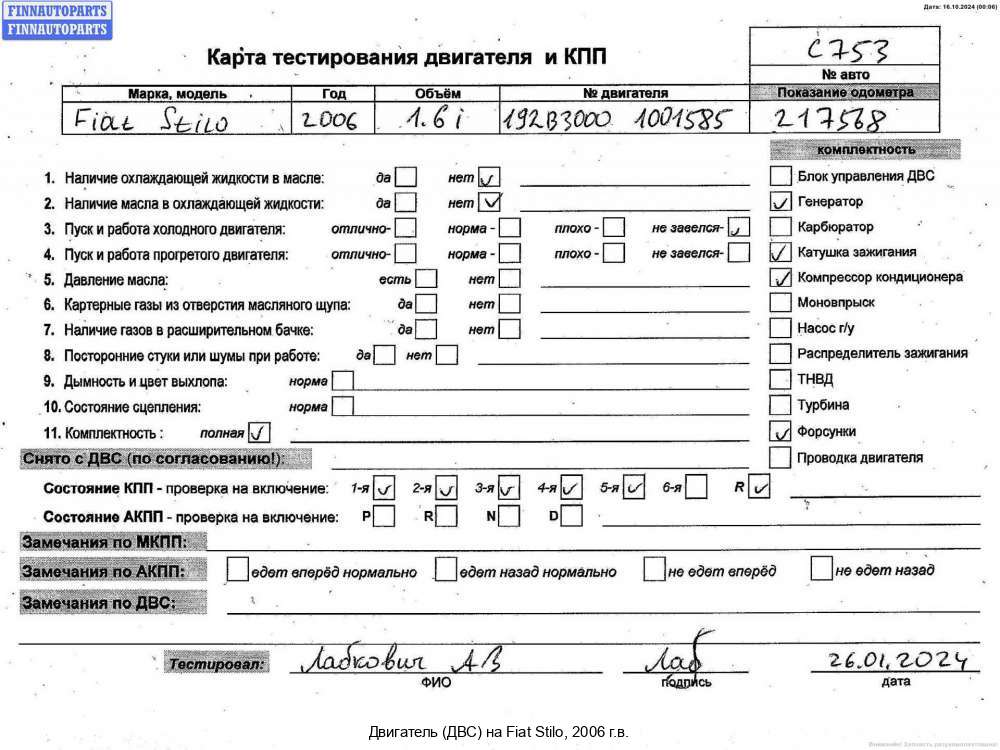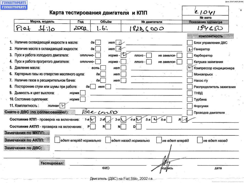 Компания FINNAUTOPARTS занимается продажей контрактных (б/у, бывших в употреблении) запчастей для иномарок. В нашей компании продаются только оригинальные запчасти из Европы, Японии и Кореи, которые не имеют пробега по РФ. Если вы хотите приобрести двигатель (ДВС) (бензиновый) для а/м Фиат Стило, смело обращайтесь в нашу компанию. Все наши менеджеры — профессионалы своего дела, и с удовольствием помогут вам купить запчасти, в том числе, двигатели (ДВС) бензиновые, на Fiat Stilo и другие автомобили.